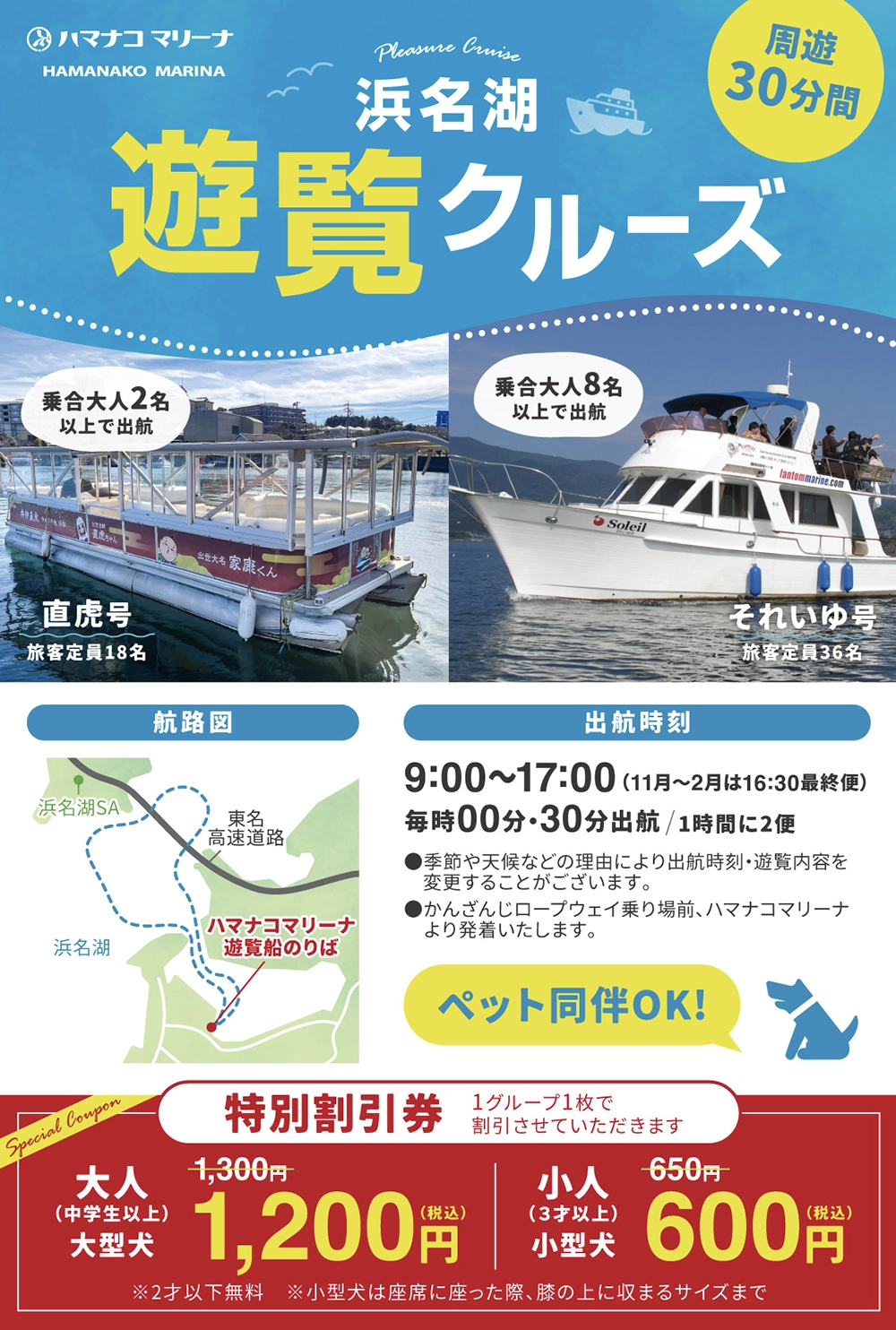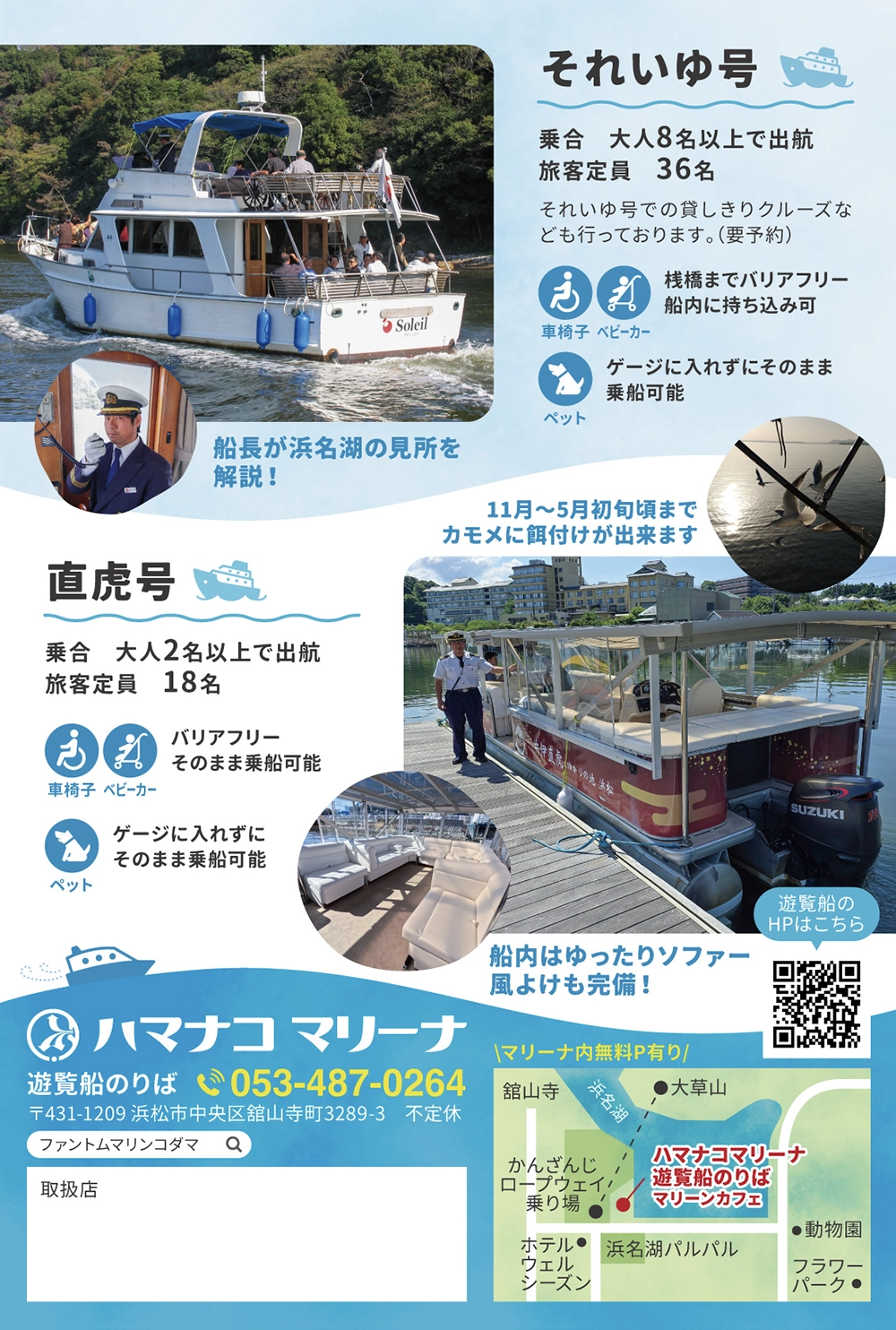 静岡県浜松市の観光地、舘山寺温泉で遊覧船やパラセーリングなど様々なマリンアクティビティが楽しめるファントムマリンコダマ様の、浜名湖遊覧クルーズ割引券を制作させていただきました。