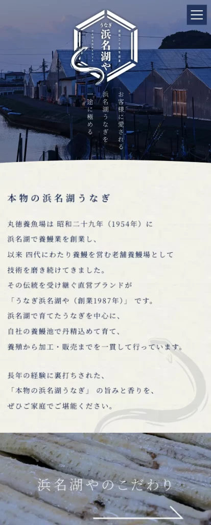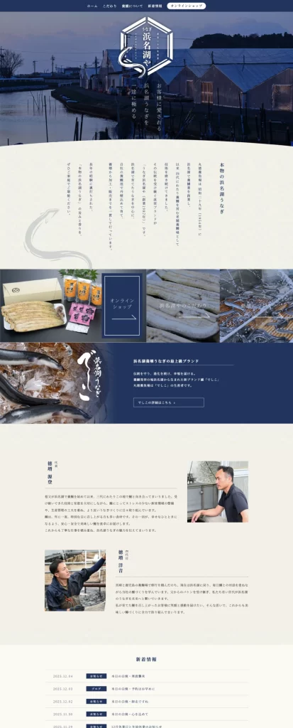 静岡県浜松市で、鰻の養殖・加工・販売をしている浜名湖や様のホームページを制作させていただきました。四代にわたり受け継がれてきた養鰻の技術と信頼が伝わるよう、全体のデザインには紺色を基調に、落ち着きと伝統を感じさせるトーンを採用しています。