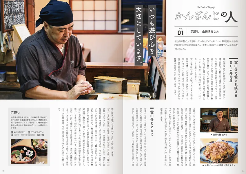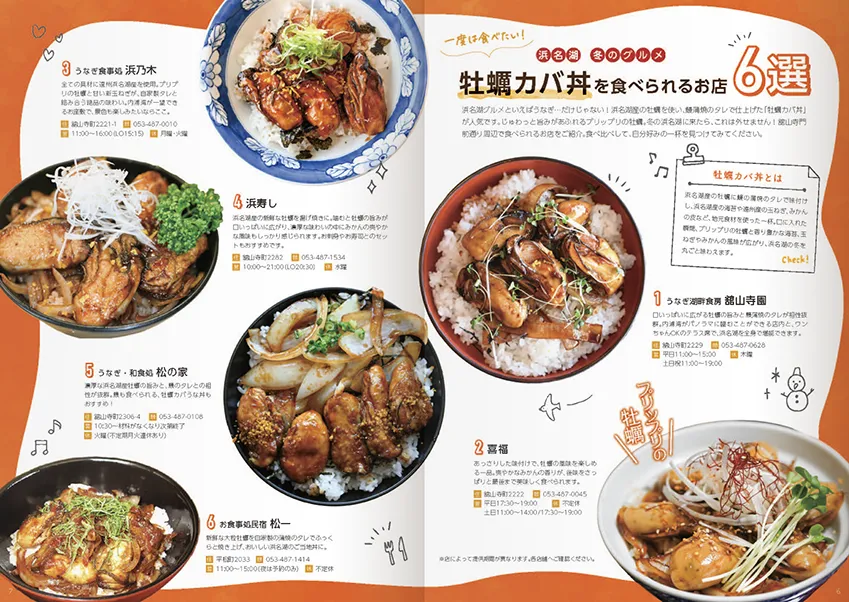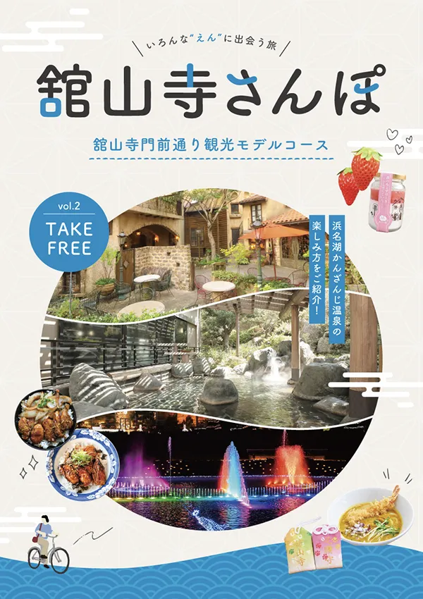 舘⼭寺温泉・舘⼭寺⾨前通りの観光モデルコースを紹介するフリーペーパー「舘⼭寺さんぽ vol.2」を制作させていただきました。牡蠣カバ丼の特集やインタビュー記事を載せ、舘山寺の楽しみ方がたっぷり詰まった一冊になりました。
