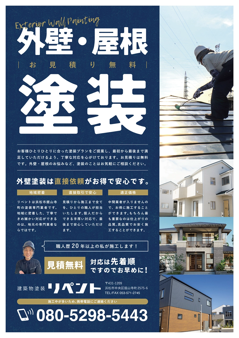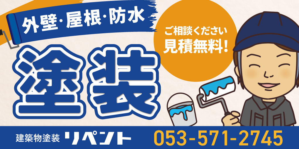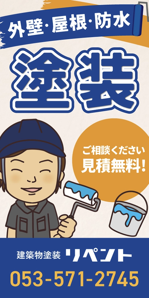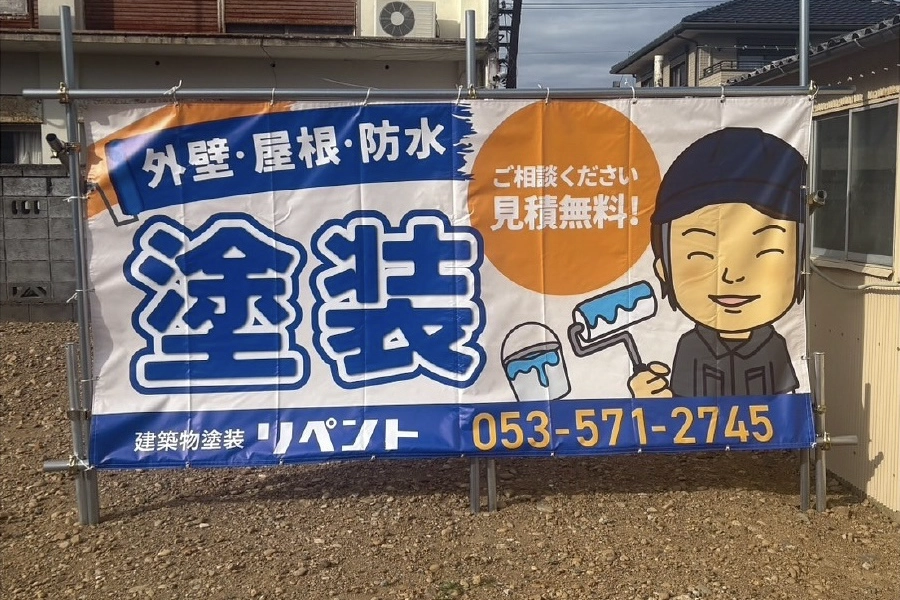静岡県浜松市の建築物塗装リペント様の足場幕、チラシ、名刺を制作させていただきました。