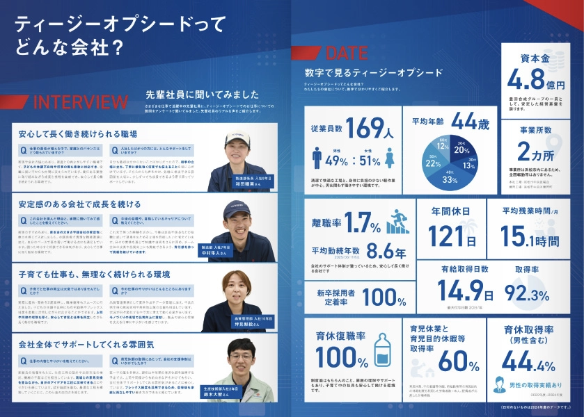 ロゴカラーの赤と青を基調に、若い世代にも親しみやすく、未来への期待がふくらむようなデザインに。 会社の雰囲気や働く魅力が、ページをめくるたびに伝わる一冊に仕上がっています。