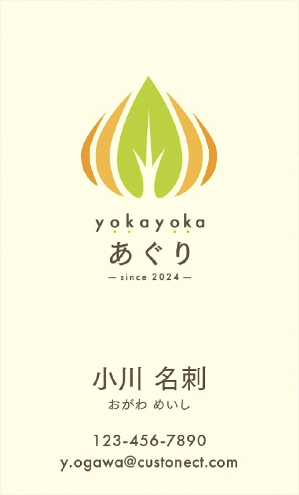 名刺は、ロゴの魅力を引き立てるよう、淡い黄色を基調にすっきりとしたレイアウトで構成。 手に取った方にやさしい印象を与える、親しみやすいデザインとなっています。
